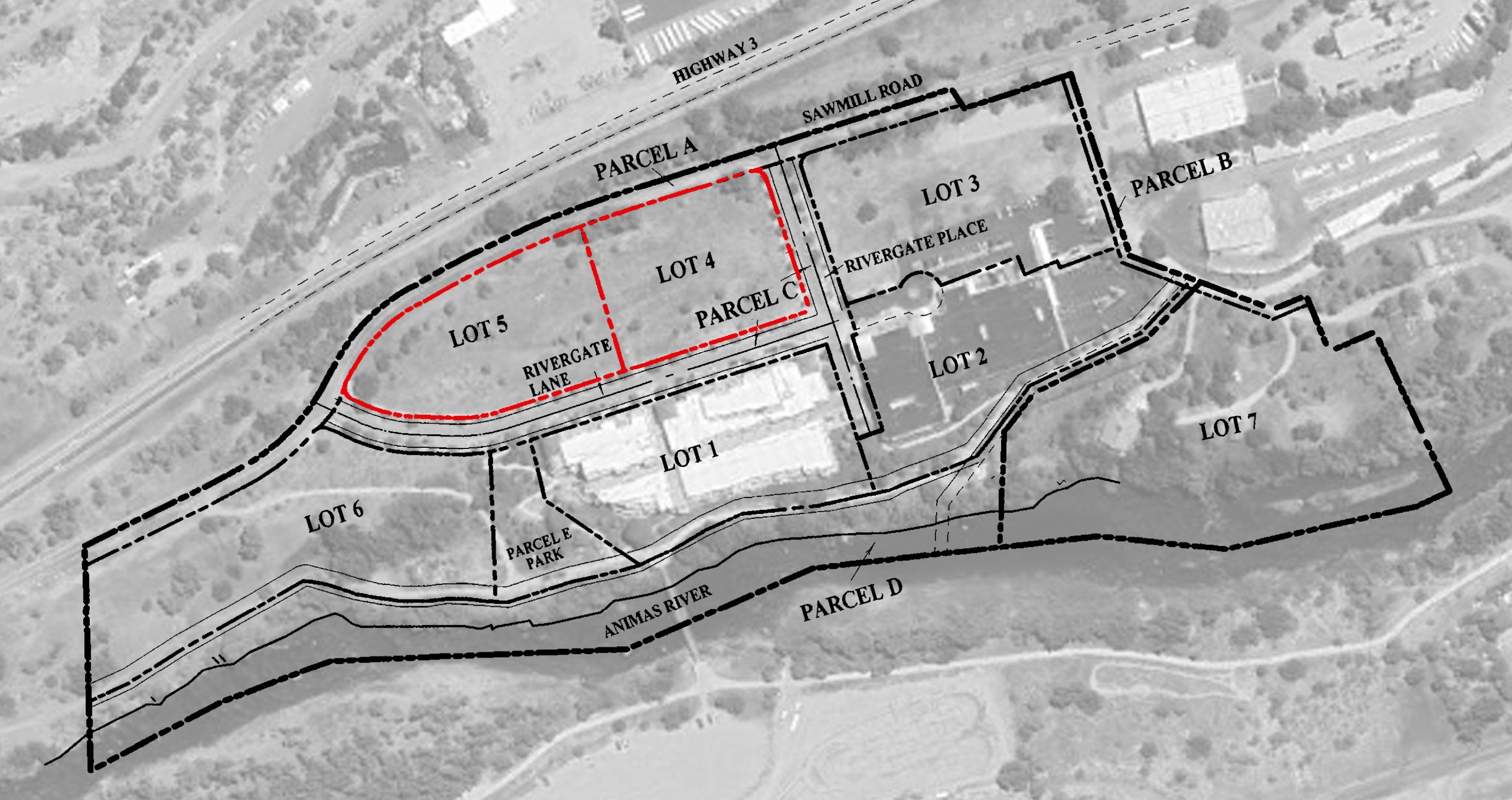 The City of Durango owns Lot 4 of the Rivergate Planned Development, a 1.665-acre parcel located between Rivergate Lane, Rivergate Place, and Sawmill Road. Originally platted in 2003, the Rivergate area was envisioned as a mixed-use neighborhood combining residential, commercial, and medical uses alongside amenities such as the Animas River Trail. Lot 4 sits adjacent to the Rivergate Lofts and Animas Surgical Hospital and is zoned “Planned Development,” permitting a range of residential and complementary commercial uses. Together, Lot 4 and the adjacent privately-owned Lot 5 allow up to 71 dwelling units at a maximum density of 19 units per acre.